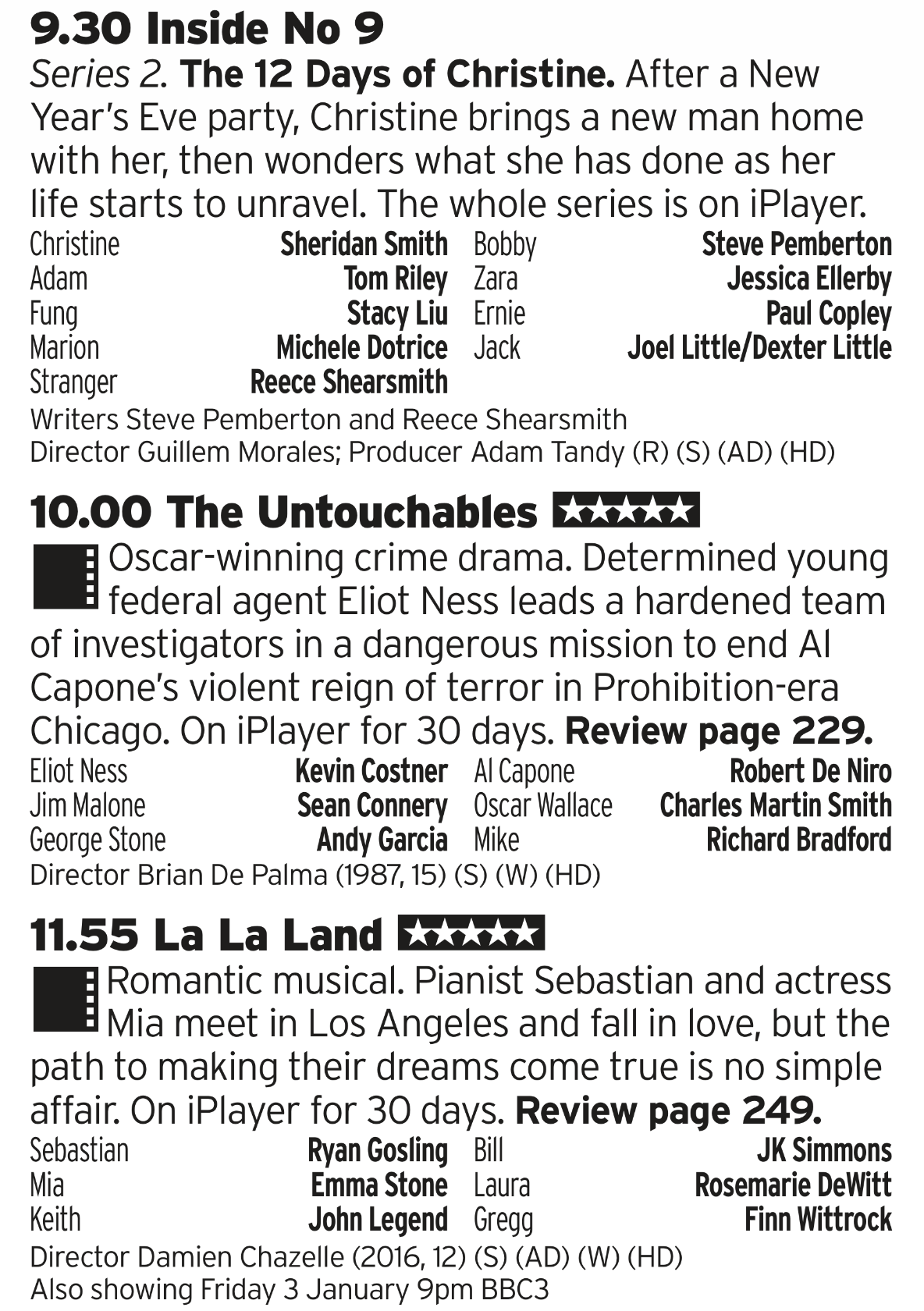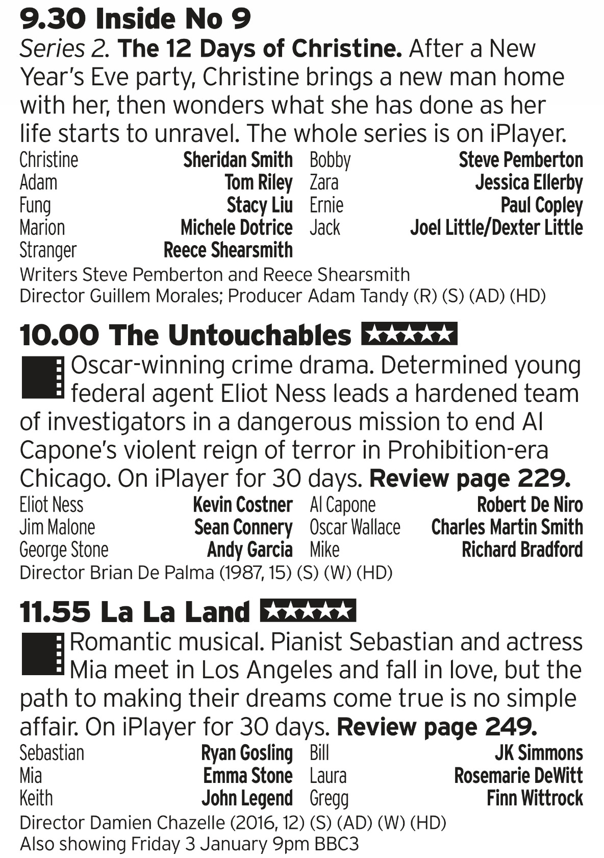Inside No 9 leads off this run with one of the best Christmas Specials of recent times. And then two brilliant films; Untouchables takes a lot of liberties with history but when you’ve got a Connery performance this good who cares? You can follow that up with a great modern romantic musical, backed up by a great cast