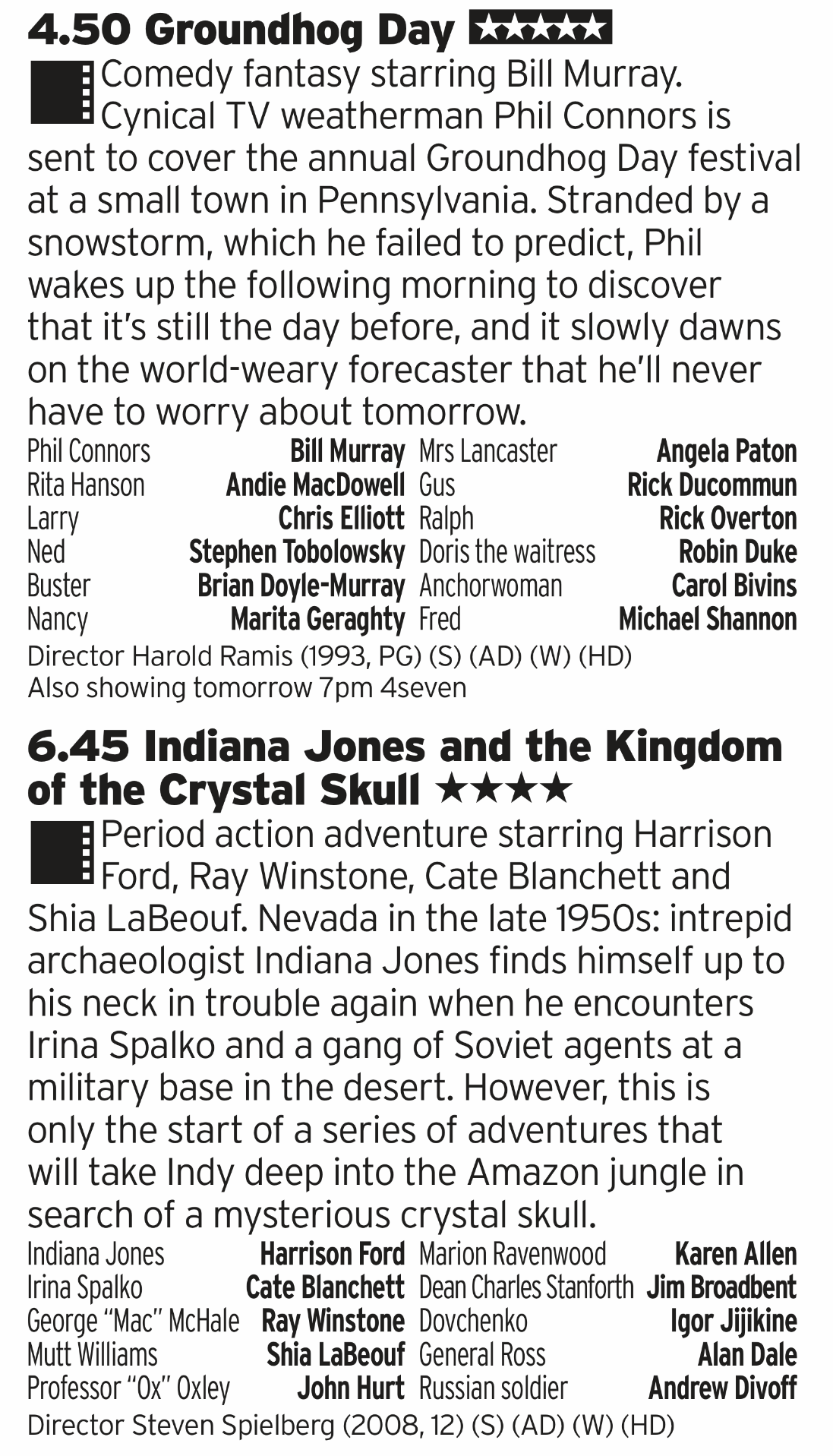 Good double bill here; it’s a bit early for Groundhog Day but it makes sense to put it on during this period between Christmas and New Year when time has no meaning. And then Crystal Skull which is a film I never hated; some parts aren’t ageing great but when it hits those pure Indy moments it’s really good