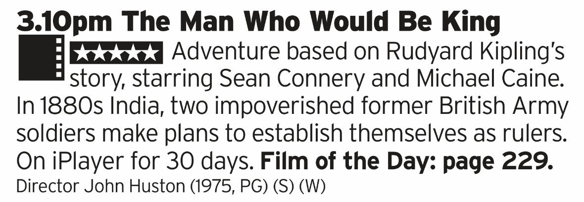 After Bond Connery dropped some clangers but this is very much the opposite of a clanger, it’s a banger! Only just noticed that rhymes. Anyways, it’s Caine and Connery off having a boys own style adventure in India; great cast, great direction, as I said a banger