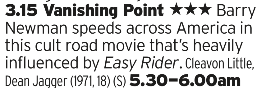 Never mind how this film was influenced by East Rider, let’s discuss how this influenced one of Primal Screams best albums. Kowalski off that album is a certified banger and lifts loads of samples from the film. And really, Easy Rider is an LSD film whereas Vanishing Point is all about that speed baby, there’s only 2 years between the films but the counter culture mindset has totally shifted. But man, what a great album!