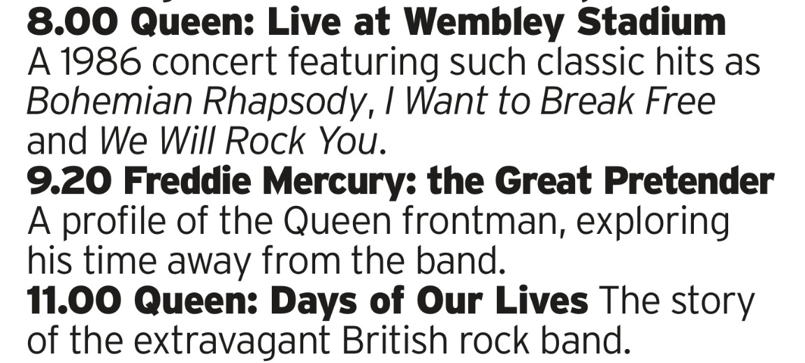 Welcome to the Queen fest! The highlight here is undoubtedly the Wembley Stadium concert; the band at their pomp rocking a stadium with songs of nuclear grade power. The two follow up shows should be good as well, the problem tends to be when they focus on the other less interesting (read: boring) bandmates which was half the trouble with Bohemian Rhapsody if you ask me