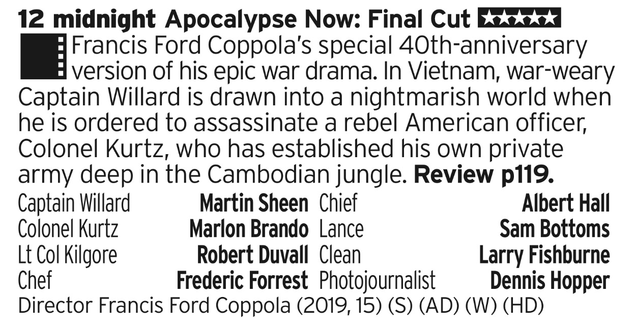 Midnight is clear the best time to start watching this extravagant directors cut of Apocalypse Now, am I right? What even is the runtime of this thing, 3 hours and 2 minutes? Beautiful. Still, that will still feel shorter than Megalopolis, that’s for sure