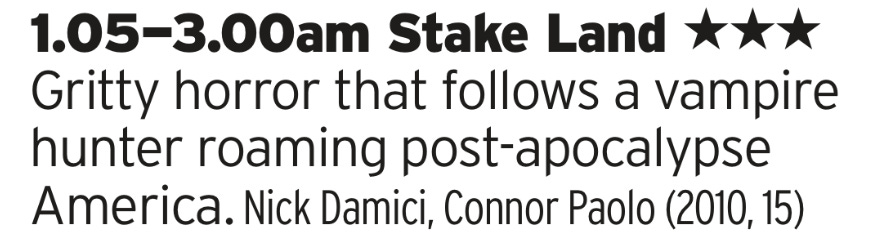 Never actually seen this but I always hear tell it’s good. In fact, to quote from the Eldest Son; Stake Land “is a banger” and “almost made [him] cry”. So there you go, solid recommendation there