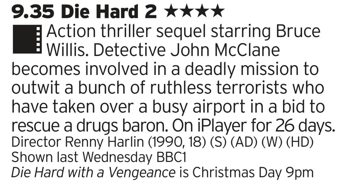 Now when you hear the folks say “oh that’s not really a Christmas film” they are actually talking about Die Hard 2; this film is also set on Christmas Eve but that doesn’t make any difference to the plot or anything, not like with the first film. The first Die Hard is essentially a festive tale of a man rediscovering the love of his family, whilst taking down a load of Grinch like Terrorists. Die Hard 2, whilst having some decent action, is just that; a decent action film that could have been set at anytime of the year with any other character. Still, got to love the Dennis Franz cameo!