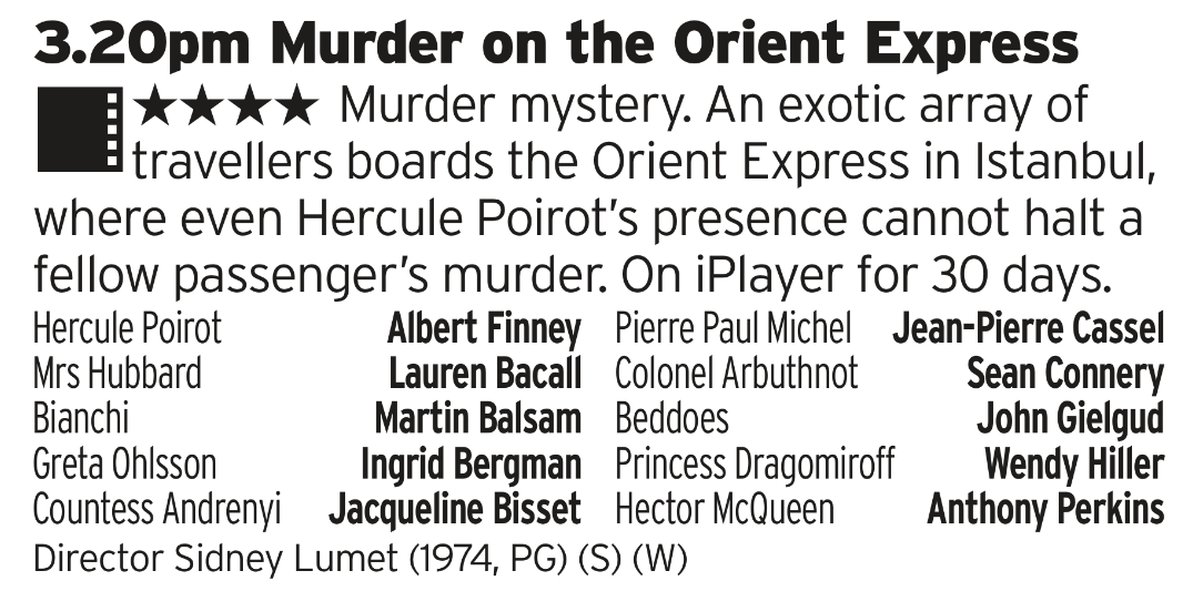 More Poirot! And think this is the third version of this story we’ve had by now? This was one of the first stabs at it (pardon the pun) and one of the best; let’s be honest, when give got Sidney Lumet at the helm it’s going to be a good one. Finney’s Poirot is also one of the best, at least until Suchet came along, so we’ll worth your time this one