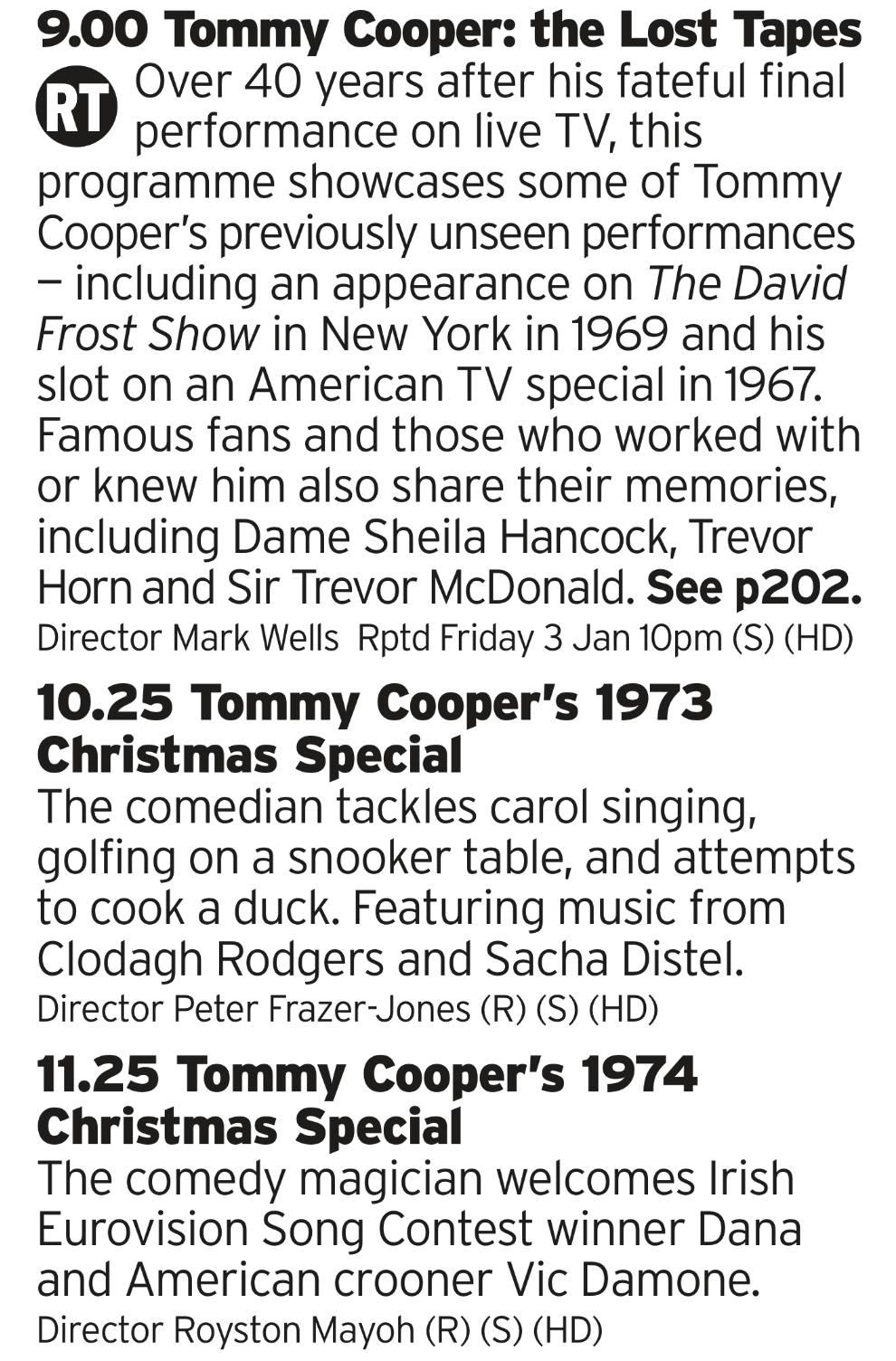 Whilst a lot of the pre-alternative comedies of the 70s were, quite rightly, put in the bin Tommy Cooper wasn’t one of them; thats probably due to his act being more about the daftness of his magic tricks rather then attacking other folk. He was often the punchline of his jokes rather than other people so you can see a through line from him to acts like Reeves and Mortimer later in the 80s. So you can go back to these shows with confidence that they won’t be too out of date. I mean, they will be given they were made in the 70s but they should still be a funner now as they were then