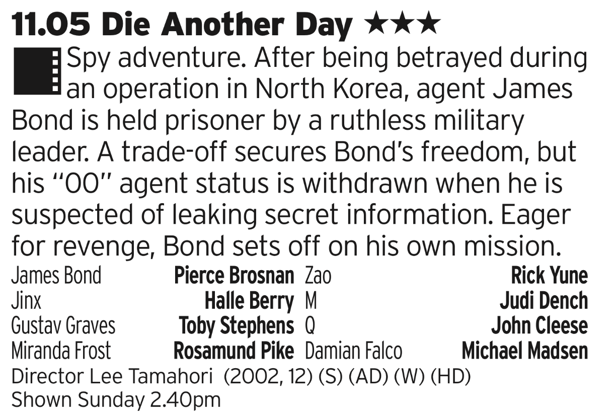 Listen, right, we can have a chat about the relative merits of Brosnan’s Bond Tenure all day long; if you twisted my arm I’d say arguably there’s more misses than hits but the one that did hit is one of the best ever so surely that overshadows the others? Point is, Die Another Day has one of the best Bond Themes and I will die on that hill as many times as needs be until everyone else agrees with me