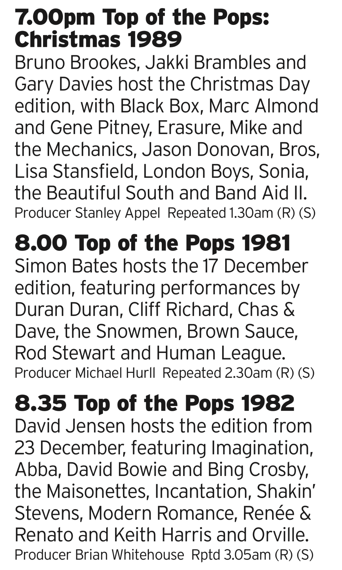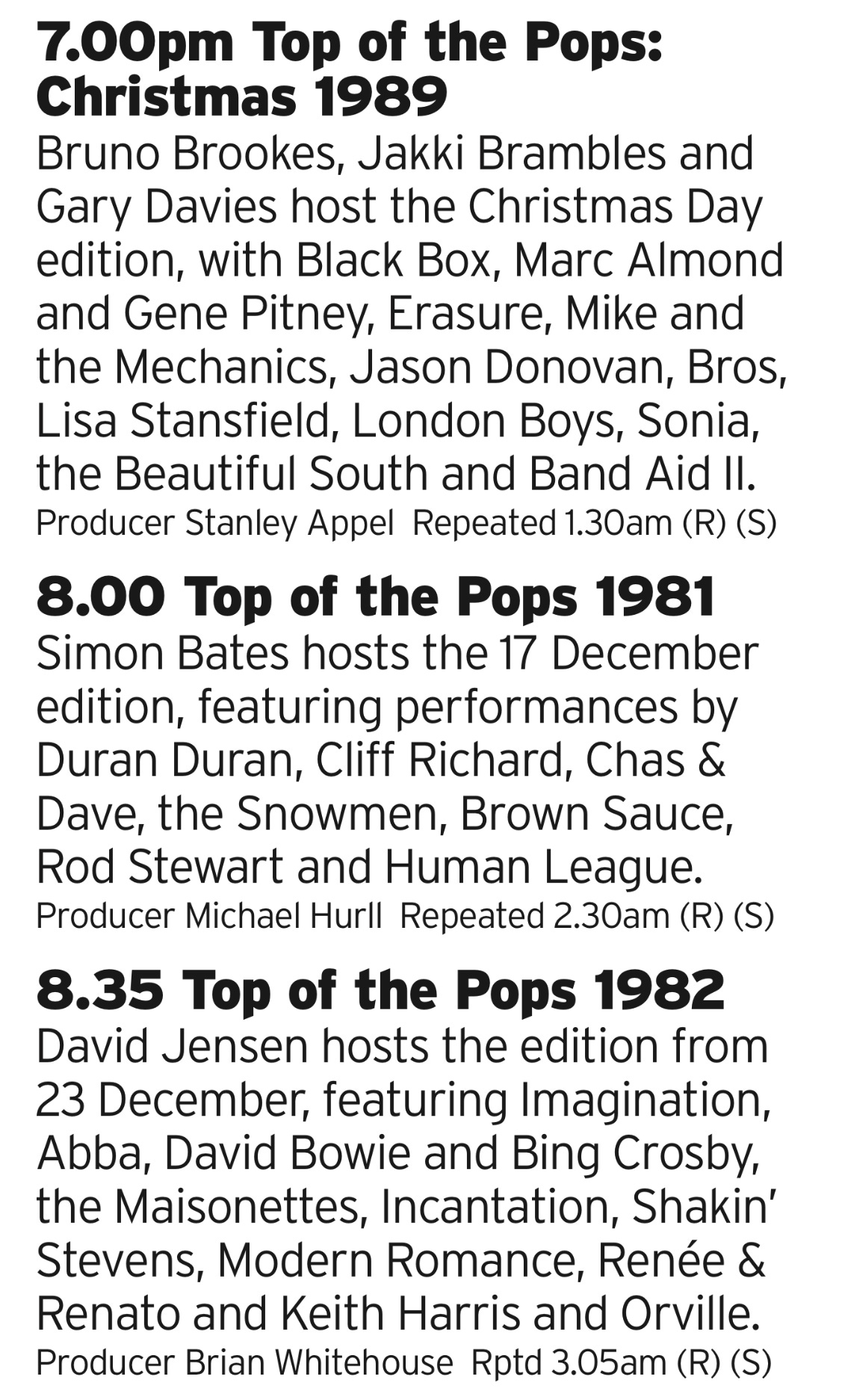 Oh boy, here’s some nostalgia for any of you fellow 80s kids out there. Just look at some of those names: Black Box! Chas and Dave! Keith Harris and Orville! A special commendation should go out to the lads having to check these specials for any appearance from any Certain Characters of the Era because, as usual, we can’t have anything nice forever