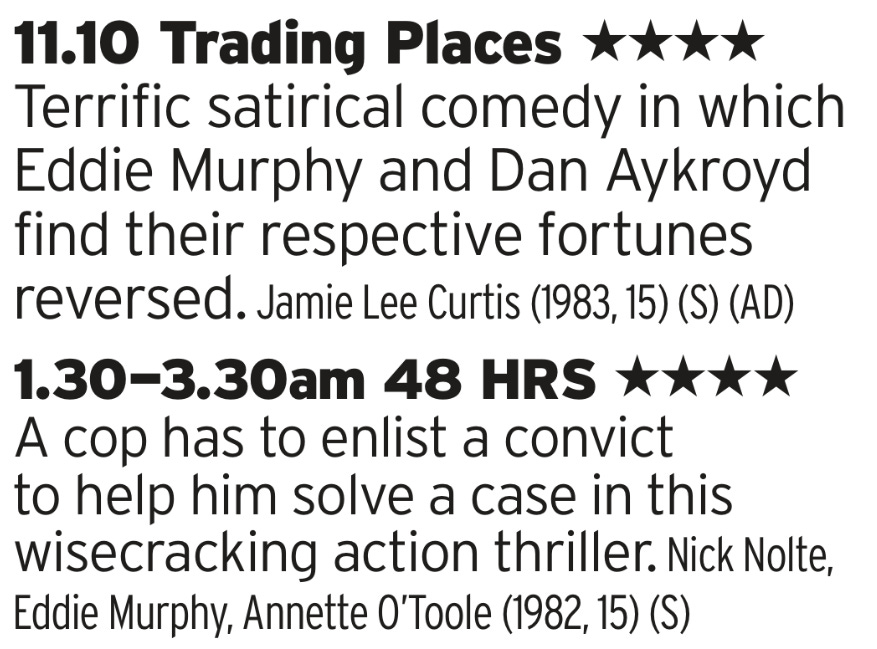 A nice double film here, part of the run of insane form that Eddie Murphy was in during this period; you have his stand up, then his awesome run on Saturday Night Live, then the one-two punch of these films. In 3 years! Then he follows it up with Beverley Hills Cop! Thats a crazy run and no mistake.