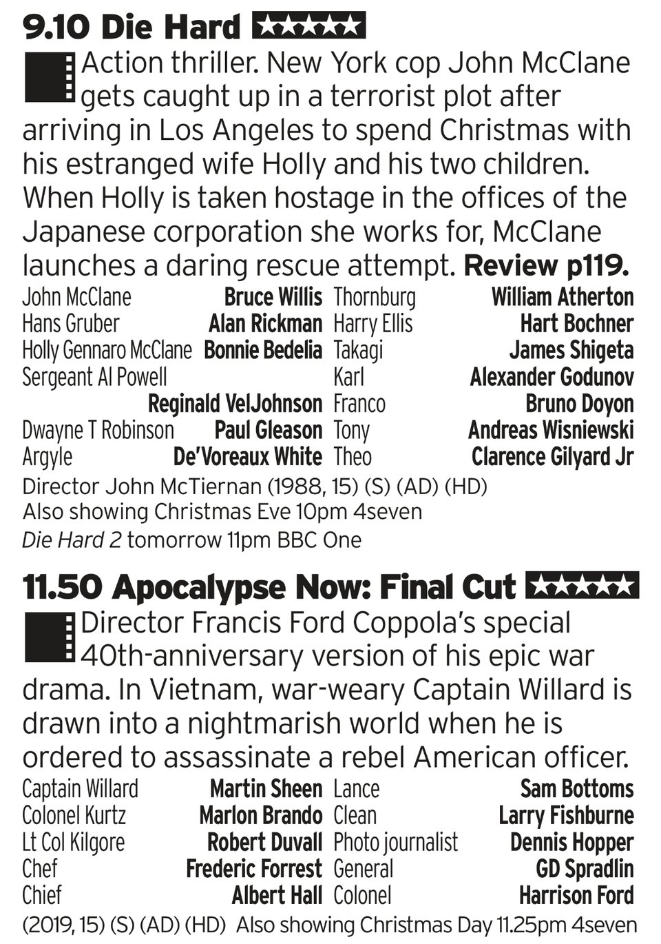 The perennial chat that comes around each year of “is Die Hard a Christmas film” is so boring it goes without saying. Just relax and enjoy it! It should really be on Christmas Eve timed so that when Hans its the ground at midnight but I’ll leave that for you to sort out. Oh, and then there’s Apocalypse Now after it for a pretty weird double bill.
