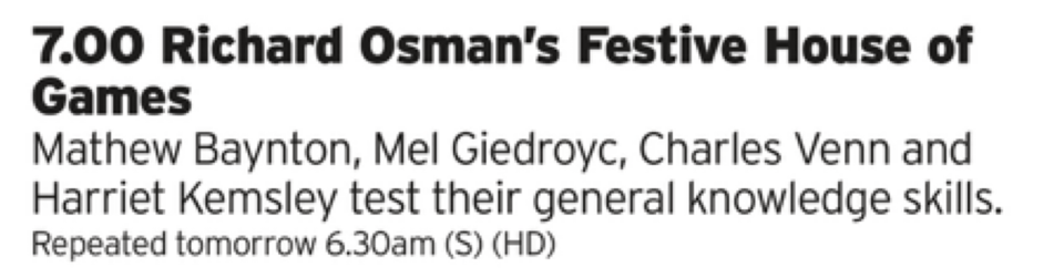 I do love a bit of House of Games so have to recommend a Christmas one. It can border on being a bit smug but the good quizzing keeps everything on side