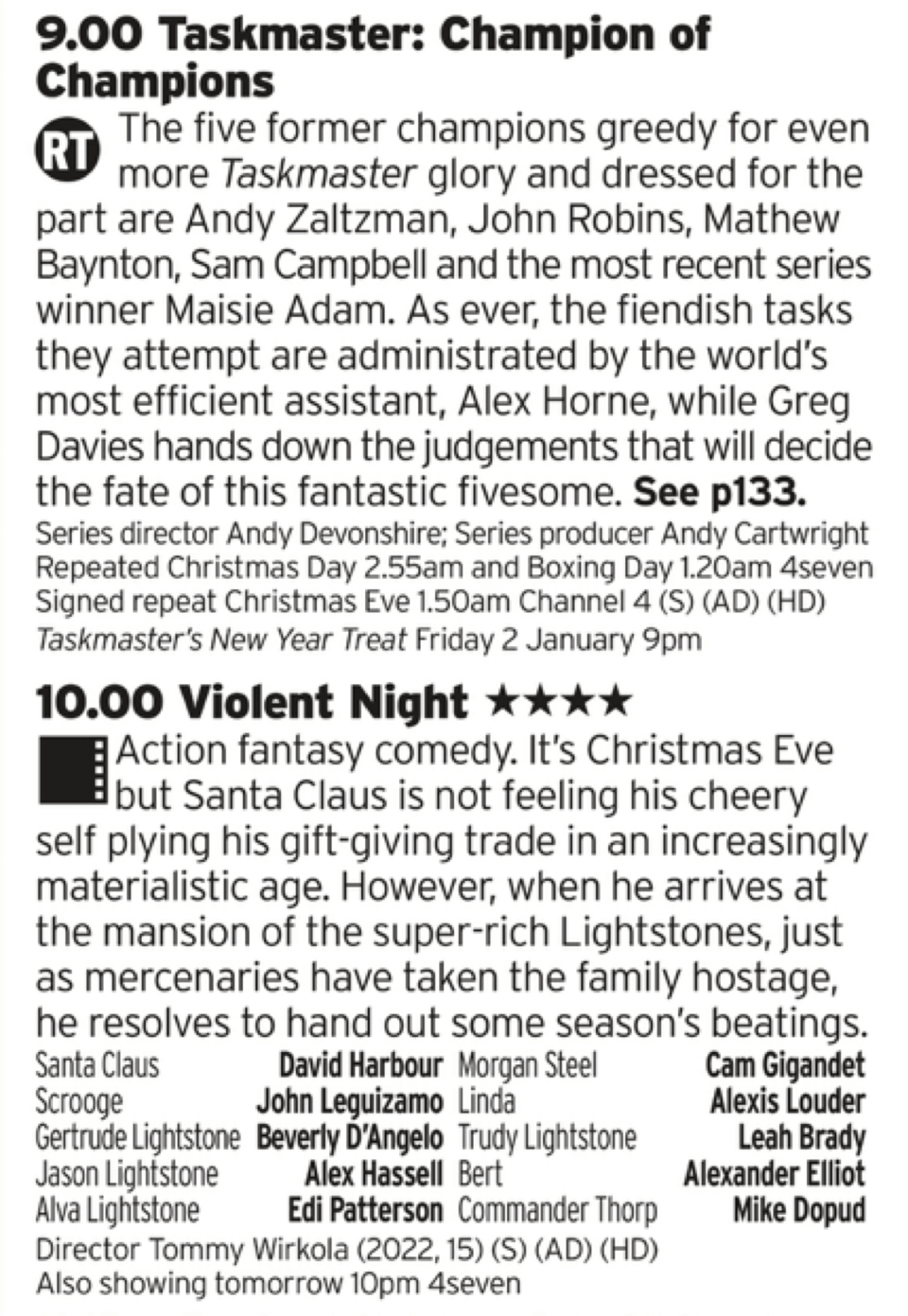 Speaking of daft quiz shows, it doesn’t get any better than Taskmaster so get this on your list of things to watch. And you can follow it up with an absolute belter of a Christmas film as you have Santa beating up a load of mercenaries. Its a hoot of a film, one that Leguizamo all but steals right out of Santa’s sack