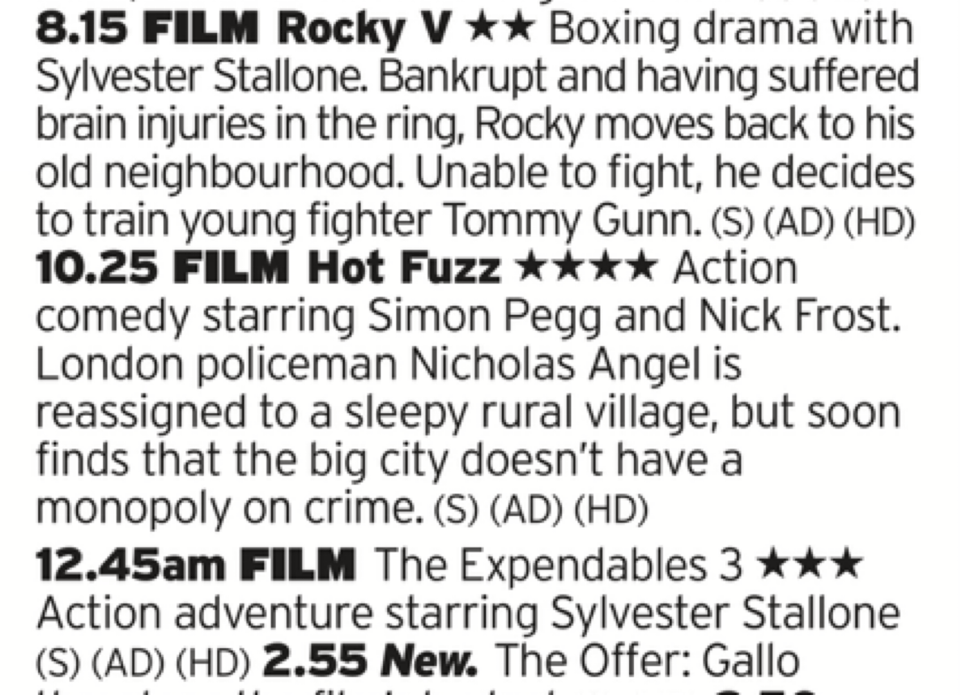 An up and down series of films here; thankfully Rocky didn’t end on this damp squib of a sequel which is yet another tonal shift in the series after IV cured the world of communism. Hot Fuzz is the second of the Cornetto Trilogy which doesn’t quite beat Shaun but it still a great watch. And then some more shooting, although I’m sure it was called Exp3ndables or something along those lines