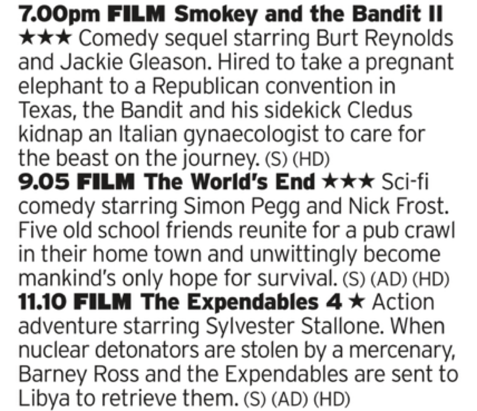 Smokey and The Bandit II is some ride, being that a lot of it revolves around an elephant. A big elephant in a truck and Burt’s moustache. Yep, it’s some ride. World’s End is the last of the Cornetto films and is alright? There’s just not much it can do to follow two of the best British films of the 2000s in the form of Shaun of The Dead and Hot Fuzz. And if you want it then there’s another Expendables film although the joke was wearing very thin by this point. And sure it was Expend4bles this time around