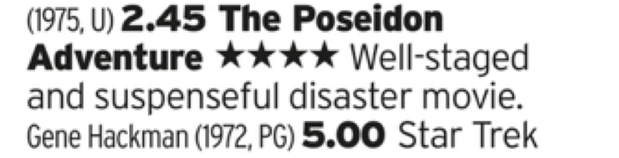 This is the proper stuff; a sweaty Gene Hackman shouting at God whilst climbing through an upside down ocean liner being watched by a just as sweaty Ernest Borgnine. It’s what the Christmas holidays were made for.