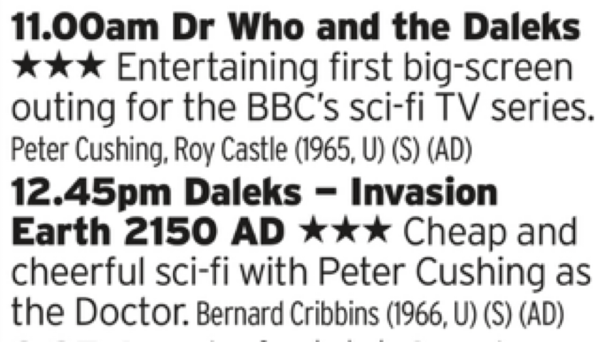 Time to start the day with back to back Doctor Who movies which feel like big colourful daft relics of a different timeline. Seriously, it's wild how they could do these in the cinema whilst it was on TV at the same time. Do love a bit of Cushing as the Doctor though, he’s great value in both of these daft films