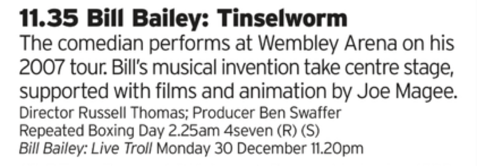 A good chunk of Christmases growing up was getting a comedy video, the main ones I remember being Bottom Live or one of the Eddie Izzard’s. So let's replicate that here with a bit of Bill Bailey, can’t remember if this is one of his best ones or not but as a baseline Bill is a hoot so should still be fun