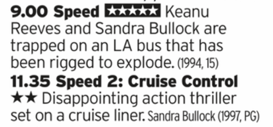 What a joy for you here; one of the tip top very best action films of the 90s, a Keanu Reeves classic and then its really bad sequel. Having these back to back is a treat, although how long that feeling of is being a treat lasts into Speed 2 can only be speculated on