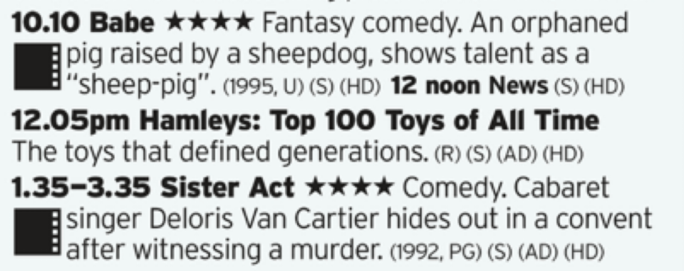 If black and white tales of rich folk having a bad time isn’t your thing then get a bit of Babe in your life; everyone wants to see a cute film about a talking pig right? Then have some lunch or watch the toy show if you fancy but make sure you come back for Sister Act to put a good amount of joy in your afternoon