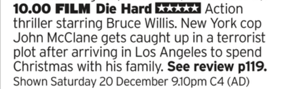 Yeah, I know we’ve already had this before but this is on actual Christmas Eve when the film is set so you can properly time the start of Christmas Day for when Hans Gruber hits the sidewalk. What a treat!