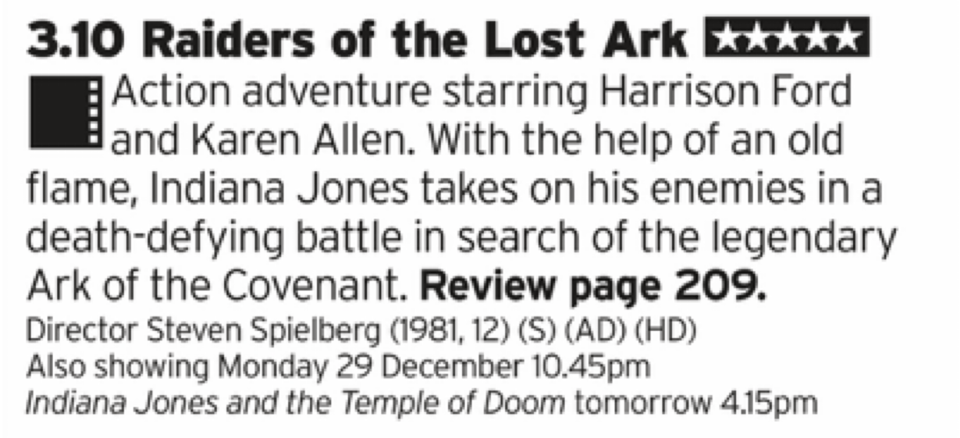 Oh this is the stuff, a perfect film for Christmas Day; Indiana Jones running about the place punching nazis and finding religious artefacts. Belter!