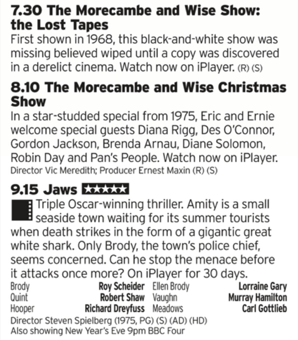 It wouldn’t be Christmas unless we have some Morecambe and Wise and here we have a couple of their shows; once from their early TV career and then a Christmas Special; ‘75 isn’t one of the S rank shows but they still have a base line of funny that keeps them enjoyable. Then one of the best films ever with flipping Jaws! What a Christmas treat!