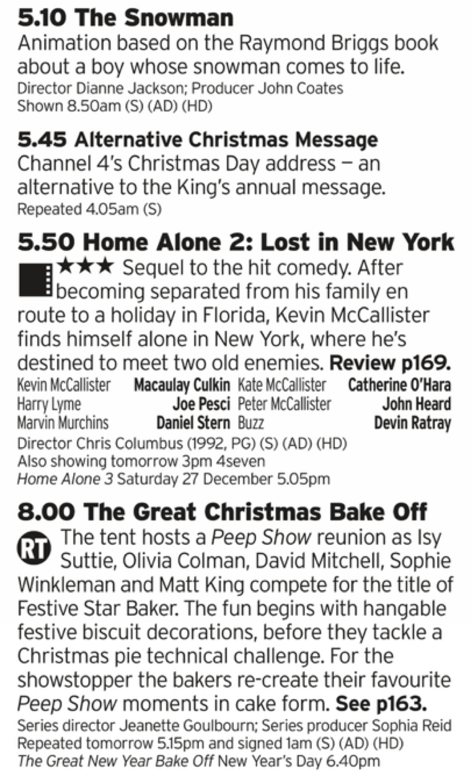 Just in case it wasn’t enough yesterday here’s The Snowman again before we get the superior Home Alone film. No, it is, despite being essentially a remake of the first film the escalation of the violence is just chefs kiss. And a Peep Show Bake Off! Obviously won’t really be a big deal for those who didn’t watch Peep Show but they should be a strong enough cast to enjoy regardless