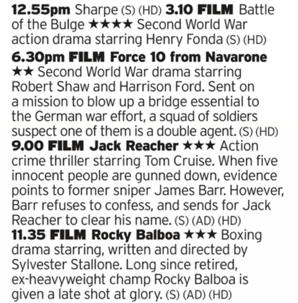 War movies! A good one and a decent one, then we’re off with a wildly miscast Tom Cruise which is fine if you don’t care about that kind of stuff as the film is really good, well worth an extra star. And then some more Rocky only this time its old Rocky coming out of retirement one last time. At least I think it was one last time, its hard to tell with him sometimes