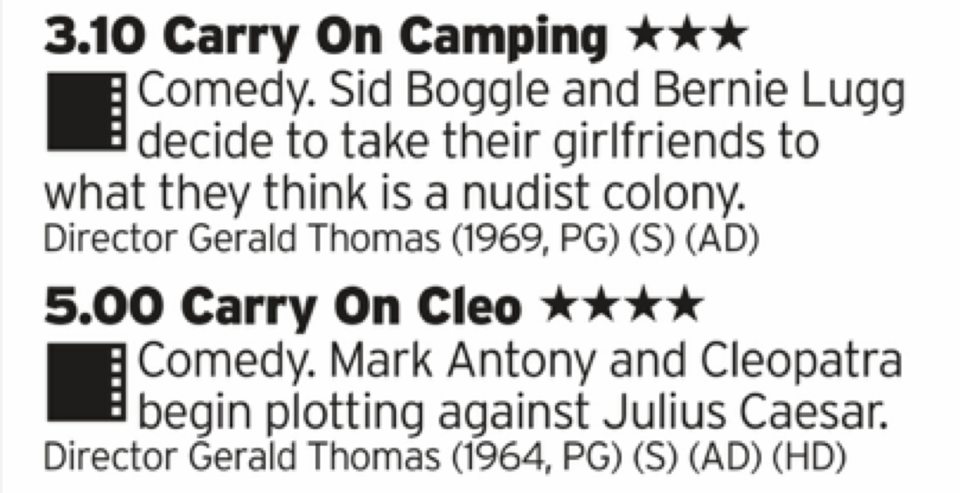 ITV3 normally does at last one day over Christmas thats all Carry On films but not this year, today we just get two of them and two of the better ones; Camping is probably the most iconic as it has that scene with Barbara Windsor and her bikini top. However Cleo is the one to watch as its probably the best of the series with at least 3 jokes that worth their weight in gold