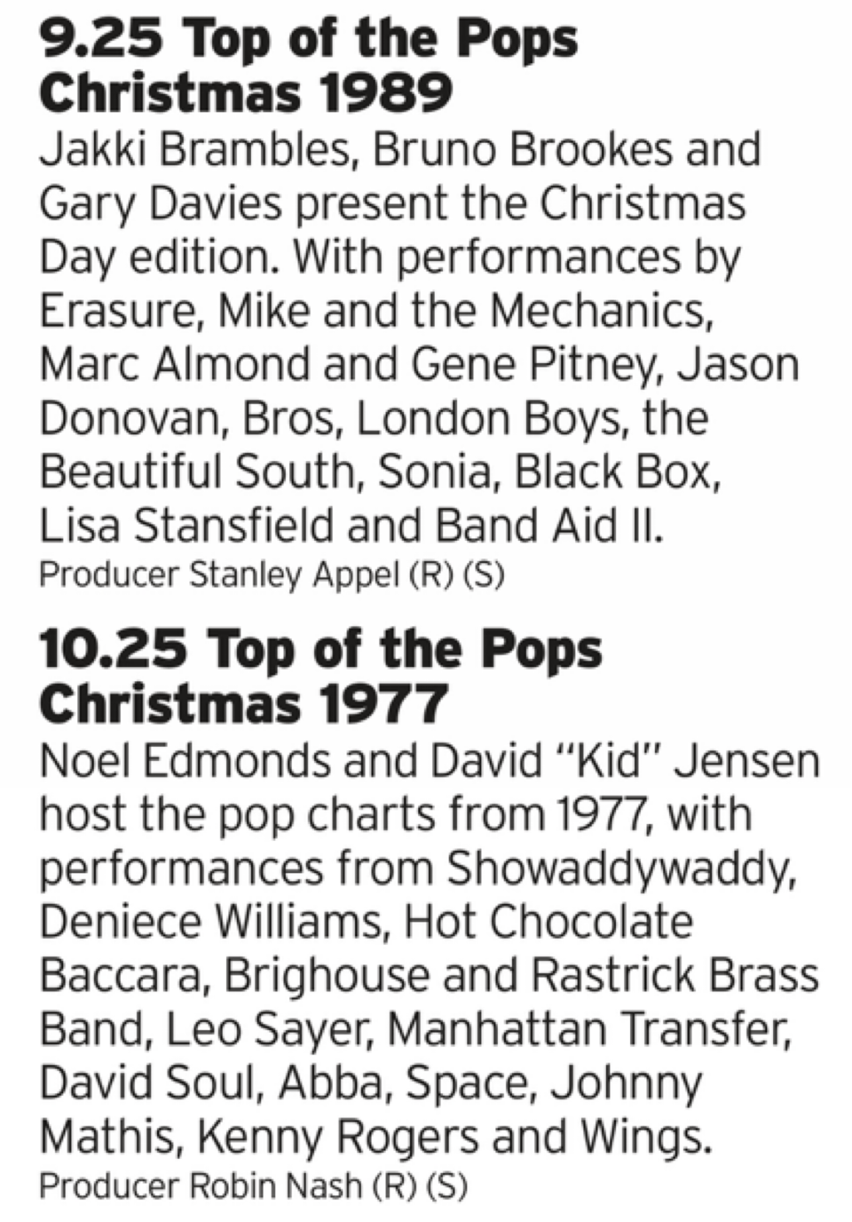 Wow, what a difference ten years or so make. Although there is an interesting thematic link between the two as both shows are from a time where a new era is about to start; in ‘77 punk was becoming a rampaging force that would change the media landscape which is resolutely being ignored by Top of the Pops here, then in 1989 grunge is just about to do the same thing. Either way Band Aid II can get in the bin