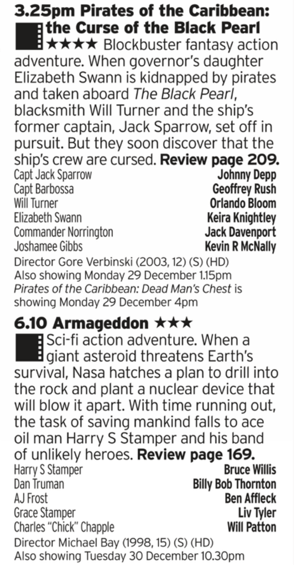 Two big old daft films for you! The best of the Pirates films, with the usual Johnny Depp warning that comes with this series. I mean, even at the time we were all a bit tired of the schtick and there were another four films after this. And then Michael Bay’s 90s masterpiece of big dumb films, with a great cast fired at a giant asteroid with full on shake-o-cam that means you can barely make out any of it. What a treat!