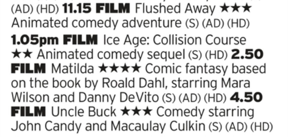 If you want to leave something on in the background all day then you could do worse than some of these films; another Aardman joint, this time one of their purely CG efforts, an entry in the Ice Age series which my eldest swears to me are all brilliant but I don’t believe him. We’ve tracked down Danny DeVito so you can do a proper Matilda comparison before winding down with some Uncle Buck if you really want to