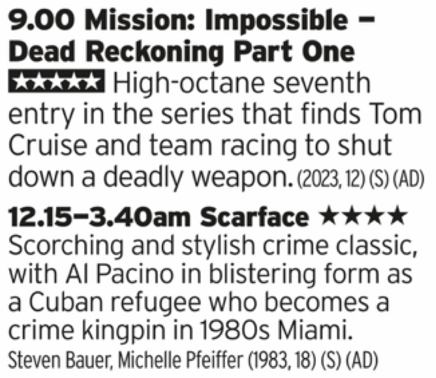 I do love a Mission: Impossible film; the over the top melodrama, insane set pieces, Tom Cruise’s ongoing attempts to end his life in a spectacular manner captured on film. Following a film as perfect as Fallout was going to be tough and Dead Reckoning doesn’t quite do it. But these films age well, even II, so maybe that will change as the years go on. Speaking of things that age well, Scarface is still a banger with the best montage sequence going