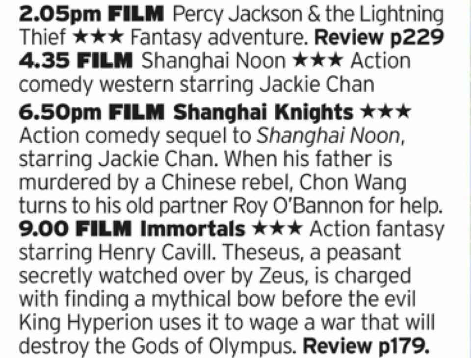 Another good run of films; I always thought Percy Jackson deserved better than it actually got as it was a pretty fun movie. The Shanghais are good late period Jackie Chan vehicles, in that the action is good but you’re not getting anywhere near Jackie’s best. And whilst I’ve not seen Immortals it always seems to crop up in those “hey you know what this film isn’t at all bad” articles that do the rounds every now and then