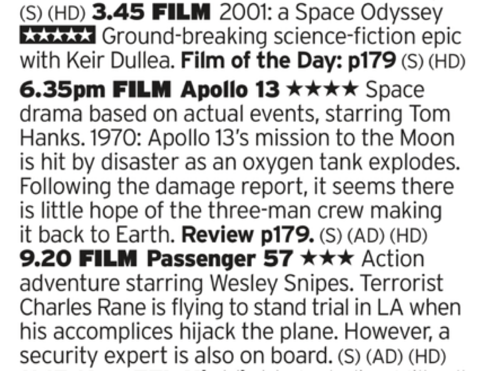Back to back space films although both have a different approach to their somewhat similar stories; both are films about what happens when things go wrong in space but Apollo 13 is very much a real life tale whereas 2001 ladles on sci-fi concepts about human evolution. And then if you find those two films are a bit dry then you can enjoy Wesley Snipes shooting baddies on a plane