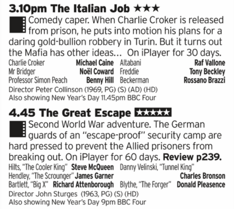 Some proper traditional bank holiday fare here with two films that are almost legally obliged to be shown when the majority of the country has the day off; Escape is the pick of the two, with its large cast of characters actors giving it plenty. The Italian Job is more of a vehicle, excuse the pun, for Michael Caine and really is a bit of a one trick pony. It’s a great trick to be fair, in the shape of a big massive car chase, but it’s the only one the film has