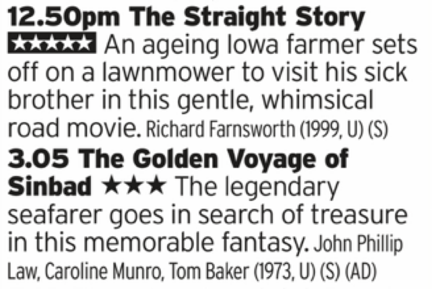 A nice double bill here, starting with something that you wouldn’t expect from a David Lynch film; a sweet family film about a guy driving his lawnmower. It’s a proper treat, and then the tone shifts to glorious Harryhausen stop motion. It's not quite the best of its class but its still a great watch