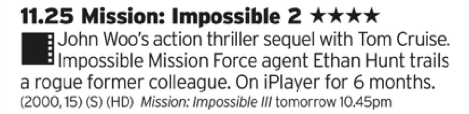 So does this mean the BBC are showing all of these? Can’t argue with that. This one is well known to be the black sheep of the franchise, probably because the hype for it was so huge. A John Woo Mission: Impossible? Limp Bizkit producing a banger of a cover of the theme? I spent hours downloading the trailer in the best quality, but the film just couldn’t bear the weight of all that hype. As time passes that gets better but its flaws don’t all go away; it is a bit of a mess and pulls the mask trick one too many times. It also establishes the Tom Cruise hair length to Mission: Impossible quality ratio that still stands to this day.