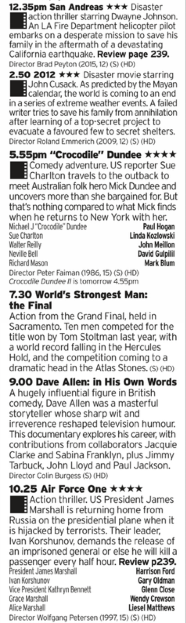 So once you’ve woken up and had some breakfast you could very easily settle down and spend all day with Channel 5 as they cover all the bases here; back to back disaster films, Crocodile flipping Dundee for your knifey/spoony needs, big lads lifting heavy stuff and moving it from one place to another, bit of comedy and then one of the top tier Dad films. A near faultless bank holiday schedule