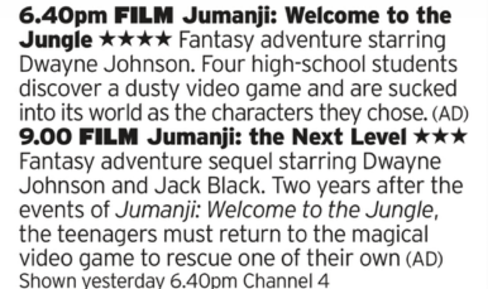 Both modern Jumanjis here for you, moving things on from board games to video games. They’re better than they should be frankly, although the first probably takes it. Also Jack Black gives good Jack Black in both films which is generally worth the price of admission alone.