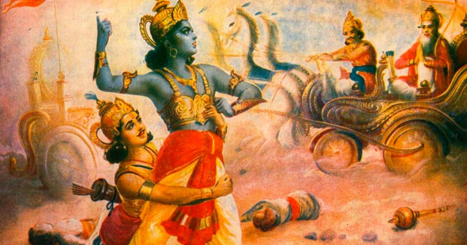 Who you think you are has to die sometimes. In the Upanishads, the ego or thinking mind is called the ahamkara, literally the "I-maker." Your thinking brain makes you think you exist as the thinker of your thoughts, the doer of your silly little errands. ("I am not the doer," I sigh to myself through gritted teeth as I drop my phone on my face lying in bed yet again.) Everybody thinks they're somebody doing something. This is the root of Arjuna's crisis in the Bhagavad Gita. It is Arjuna's dharma to fight and defeat the Kauravas. As Arjuna surveys the armies assembled on the battlefield, he sees that they are us -- if not literally his familial relatives (as some are), then what Ram Dass would call "God in drag," divine beings, people just like him. Arjuna consults on the plane of the subconscious with Lord Krishna, who has agreed to be Arjuna's charioteer; Krishna's voice is Arjuna's, since Krishna, a little spark of Source light, is our true self, the divine within.