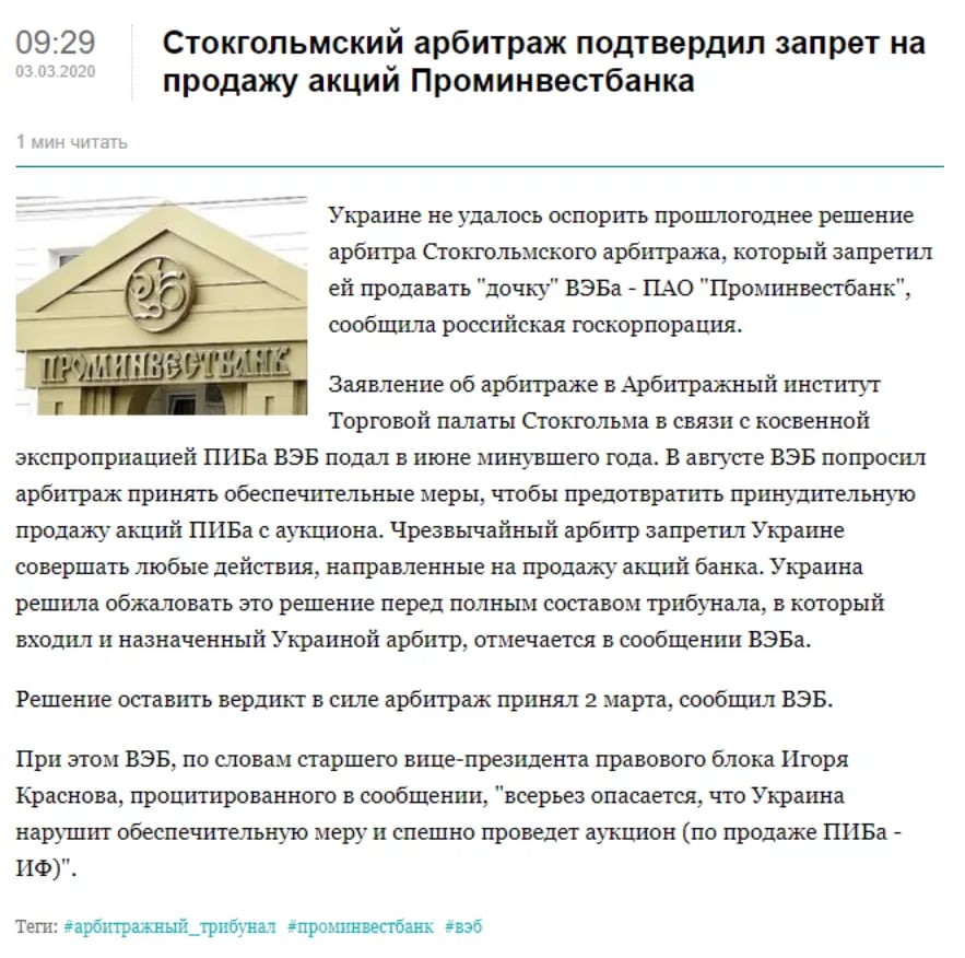 The specified decision of August 2019 was appealed by Ukraine before the full composition of the tribunal of the Stockholm Chamber of Commerce. But the Arbitration Institute of the Stockholm Chamber of Commerce, by its decision of February 28, 2020, dismissed Ukraine’s complaint about the above decision and forbade Ukraine to sell shares of PIB.