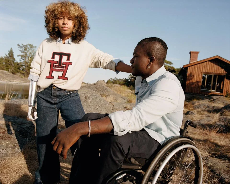 A picture from the TommyHilfiger.com website shows adaptive clothing for people with disabilities. One model has a prosthetic arm, and another is in a manual wheelchair. Both are wearing Tommy Adaptive clothing.