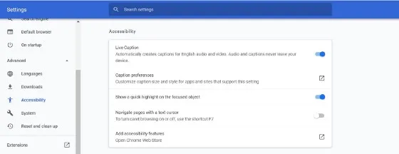 Chrome settings page where you can turn on live captioning and thicker box around the focused object. I use both. They are extraordinarily helpful.