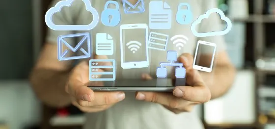Blurry image of man shown from the shoulders down holding a tablet with various types of digital symbols overlaid — mobile, cloud, email, electronic documents, servers, and networks.
