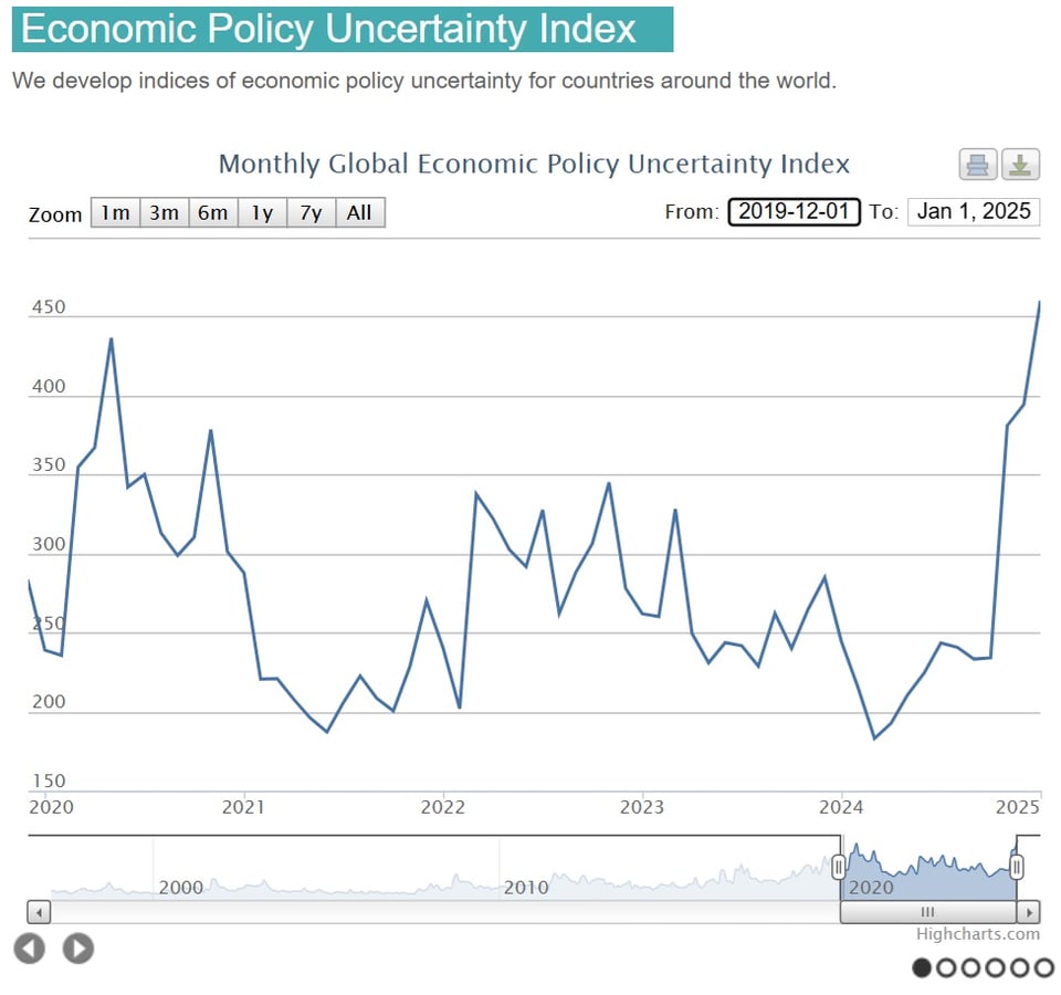 The Monthly Global Economic Uncertainty Index has spiked to an all-time high, even higher than during the pandemic.