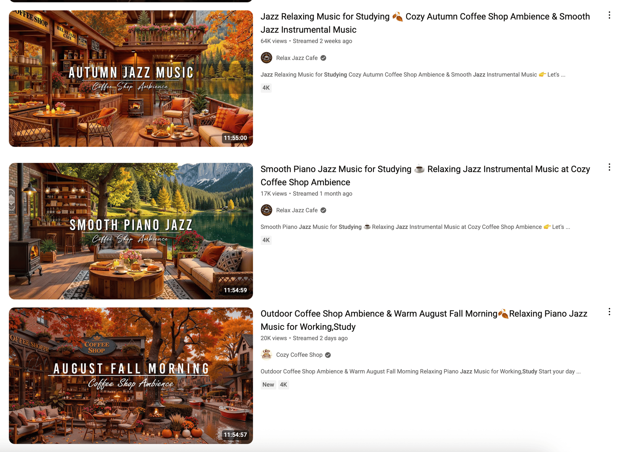 Until recently, I loved selecting 3-hour-long YouTube videos of curated playlists to accompany me while I write and work. A lot of these seem created for the express purpose of playing in the background while you do something else—they’re instrumental, they’re Bossa nova jazz, they’re “oldies playing from another room,” they’re “10 HOUR Ghibli Classics on Piano NO ADS” etc. etc.