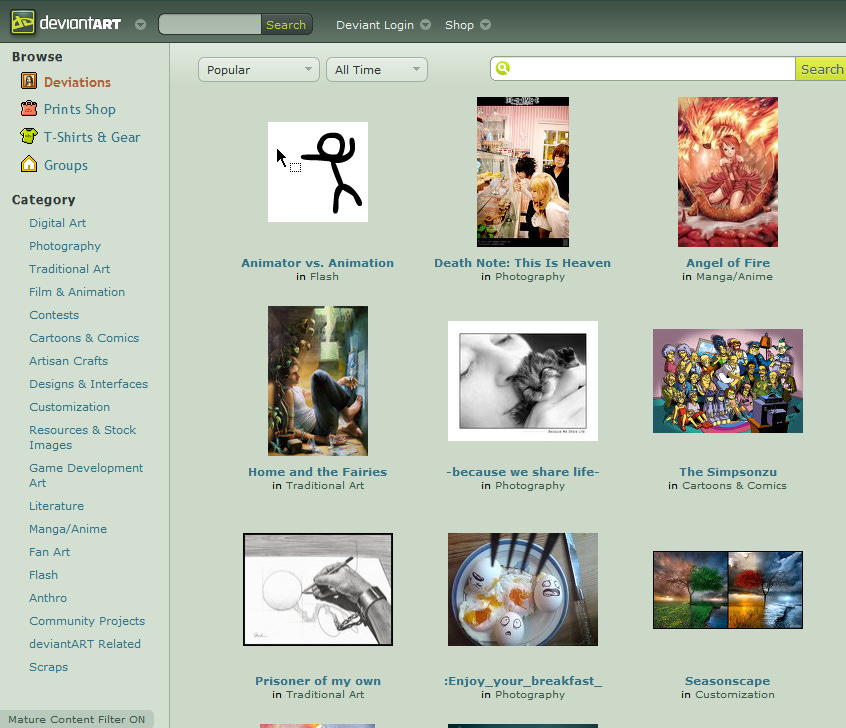 I compare my experience looking at art on DeviantArt to the experience of looking at art on, say, Instagram. On DeviantArt, you could scroll through the front page or search a keyword or go into an artist's portfolio and you would first see several works in a grid, each piece reduced to the size of a thumbnail. You selected which piece looked most interesting from afar and then you had to click on it to see it in full-size. When you did click it, Deviantart would take you to the piece's own page, where you could see it fully, zoom in, read the author's description—which would sometimes be a quick note on materials used, or a long update on the artist's life and work—and read through the comments. It was more akin to the experience of visiting a museum, where you can choose to approach the piece you wanted to see more clearly, and you could witness it with minimal distractions because of your closeness. You could strike up a conversation with the stranger viewing it beside you, if you wanted.