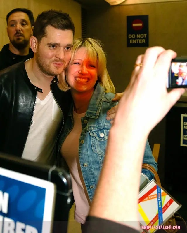 Otra de mis favoritísimas es Lindsay Blake, una mujer que vive en el Sur de California, colecciona fotos con famosos y las sube a la web con el mejor nombre de la historia: www.iamnotastalker.com. Me encanta la entrada en la que habla de su «fin de semana» con Michael Bublé y hace hincapié en su odio por los cazadores de autógrafos: «Me sorprendió ver que había como veinte paparazzis y cazadores de autógrafos [ella los llama “autograph dealers” o “graphers”] esperando a Michael. Aquellos que me leéis o visitáis mi web a menudo, sabéis que no soy PARA NADA fan de los cazadores de autógrafos: son superagresivos y normalmente intentan que les firmen 20 o 30 cosas, así que luego el famoso no tiene tiempo para nada más.» En la web también tiene secciones como «My L.A. Must-Stalk List» o «Challenge Lindsay!», donde te ayuda a adivinar en qué lugar de la geografía estadounidense se rodó tu serie o peli favorita (es como el GeoGuessr de los überdesquiciados). En «Celebrity Photo Booth» está la colección interminable de fotos que Lindsay se ha hecho con famosos, desde Willem Dafoe o Harry Hamlin1 hasta gente que ni idea. Por desgracia, lleva desde 2019 sin actualizarla y en la sección «Upcoming Celebrity Events» aparece un mensaje en el que dice: «A causa de la pandemia del Covid-19, no hay eventos en Hollywood. Actualizaré la página a medida que todo vaya volviendo a la normalidad». Y todo ha vuelto más o menos a la normalidad, pero ella sigue sin aparecer y no me acepta la solicitud de seguimiento que le envié hace un montón por IG (¿quién stalkea al stalkeador? ¡Yo!).