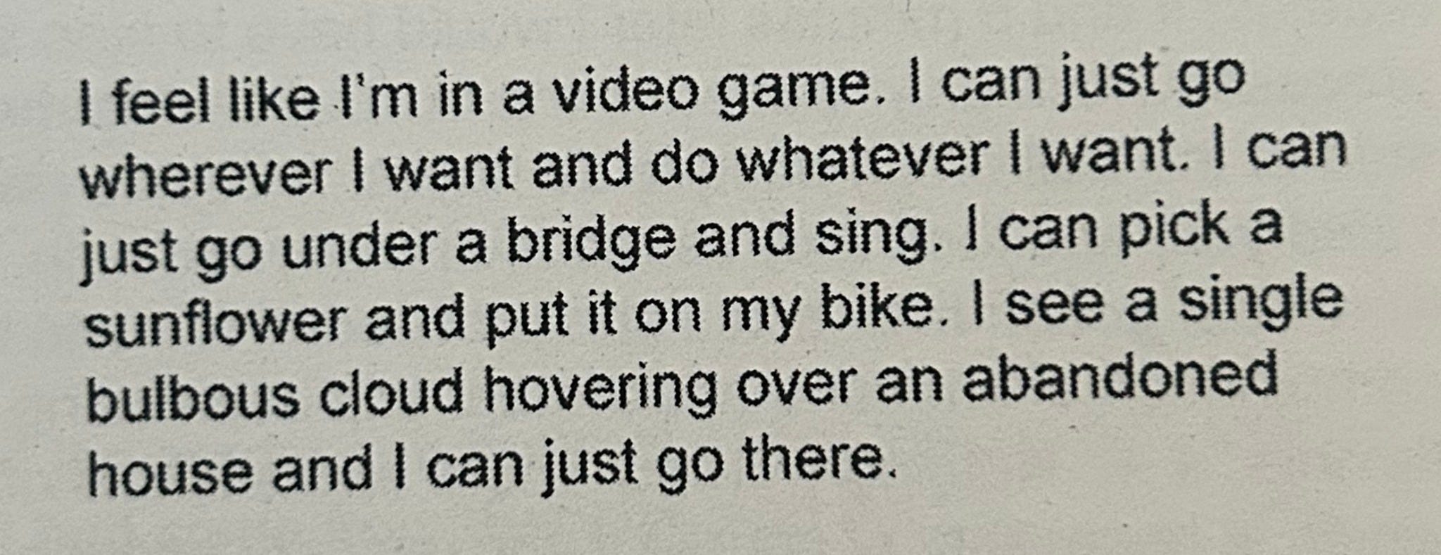 Hoy me siento un poco Flora,1 el disco de Hiroshu Yoshimura: optimista, contenta, remasterizada, agradecida (es viernes).2 Camino por mi barrio gentrificado y, como me acaban de ingresar la nómina, entro en la primera cafetería que veo. Me cobran 3 € por el café y después de preguntarme por mi signo, pegan una pegatina en la que pone «Libra» en el vaso de cartón. He sido incapaz de mentir. Intento seguir sintiéndome Flora, paseo por las calles en las que da el sol, sonrío a una niña sin querer y evito mirar el interior de las tiendas que sé que están vacías. Llego al Mercat dels Encants, donde encuentro cosas de segunda mano increíbles. Pero también tristes: el estudio de pintura de alguien, la habitación de adolescencia de un tal Xavi al que le gustaba Valentino Rossi, Camela y los monos. Compro unos prismáticos, dos llaveros, una pintura pequeña en la que pone Bon Nadal (‘Feliz Navidad’), lápices de colores y papel estampado con sobres para escribir cartas. Ahora hace un poco de fresco, pero la temperatura sigue siendo agradable. Noto el efecto del café y eso me empuja a comprar una mochila que no es muy de mi estilo (tengo que dejar de comprar cosas baratas simplemente por que lo sean). Con las manos sucias de tanto rebuscar en el stock sobrante de tiendas que ya han cerrado, sujeto las bolsas llenas de cosas que ahora tendrán que hacerse un hueco en mi casa. Son las 19h, todavía no ha cambiado la hora pero sigue haciendo sol y me siento en un banco. Pasan unos críos y me llaman «jamba», me pongo contenta y pienso en el instituto y en mi madre. Me levanto y, como todavía no me apetece volver a casa, voy por calles al azar. No sé si sigue siendo el café –a lo mejor sí que valía esos 3 €– o la nómina, pero estoy de muy buen humor y me siento libre. Saco el móvil y busco una foto que le hice al fanzine de Emma Roulette. Lo leí la semana pasada y en él, a modo de diario, Emma cuenta su viaje en bici desde Barcelona hasta Angoulême, donde iba a hacer una residencia. Es precioso y consigue describir, en pocas líneas, lo que siento ahora mismo: una libertad parecida a la de estar en un videojuego de mundo abierto. Pasa una mujer y llama «cabrón» a su perro. A todos nos llaman algo hoy.